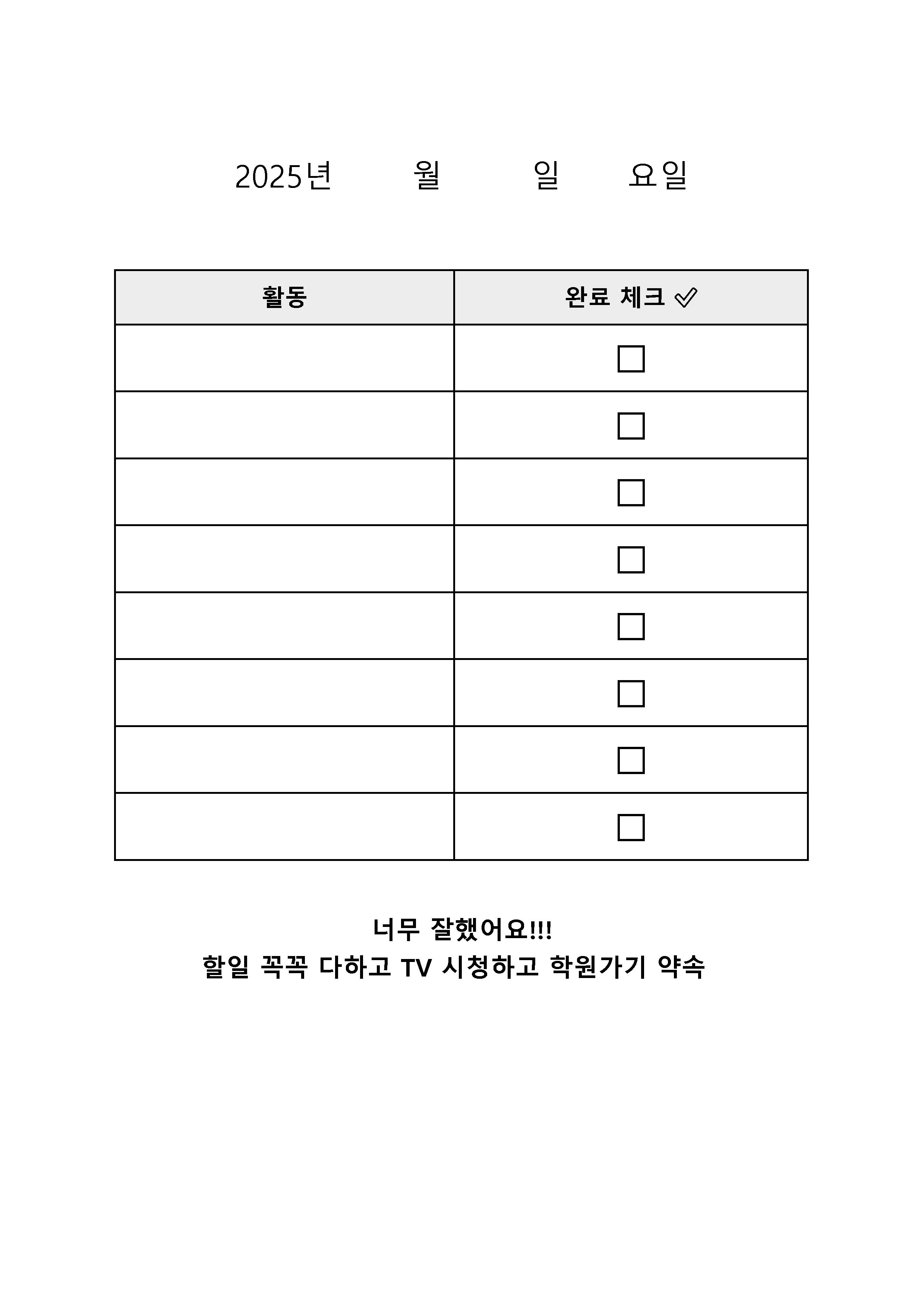 안녕하세요 몬키키입니다. 일도하고, 애기도 신경쓰다보니 양식을 미리 올린다는게 방학 다 끝나가서 양식 올리게 되버렸습니다..ㅜ 꼭 방학이 아니라도, 집에서 아이에게 매일 과제를 부여해서 혼자 스스로 과제를 성취할 수 있도록 하루하루 체크하도록 해도 좋을 것 같습니다. 저는 방학동안 제가 밖에 일하러 나갈동안 아이가 혼자있을동안 시간이 붕 떠버려서 제가 없이도 혼자서 숙제랑 방치우기 등등 혼자 할 수 있는일들을 해놓게 하기 위해서 체크리스트를 만들어놨어요. 오전에는 어찌저찌 방과후 프로그램을 한다지만, 오후에는 학원수업 갈때까지 시간이 좀 남아서 점심먹고 티비보고 하면 그 시간이 무의미 하게 흘러가거든요. 그게 좀 아깝기도 하고.. 일단 이렇게 해서 만들어주니까 아이가 루틴처럼 잘 하더라고요. 잘 하면..