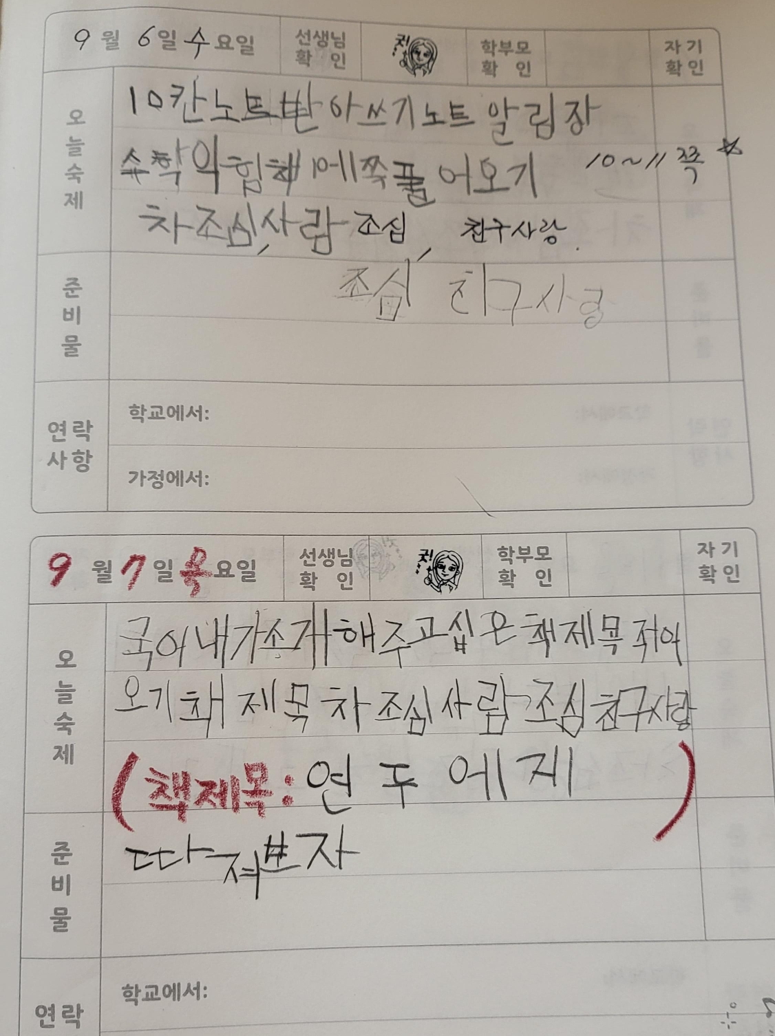 2학년때는 제법 컸다며 이제 알림장을 개학 첫날부터 써야한다.
