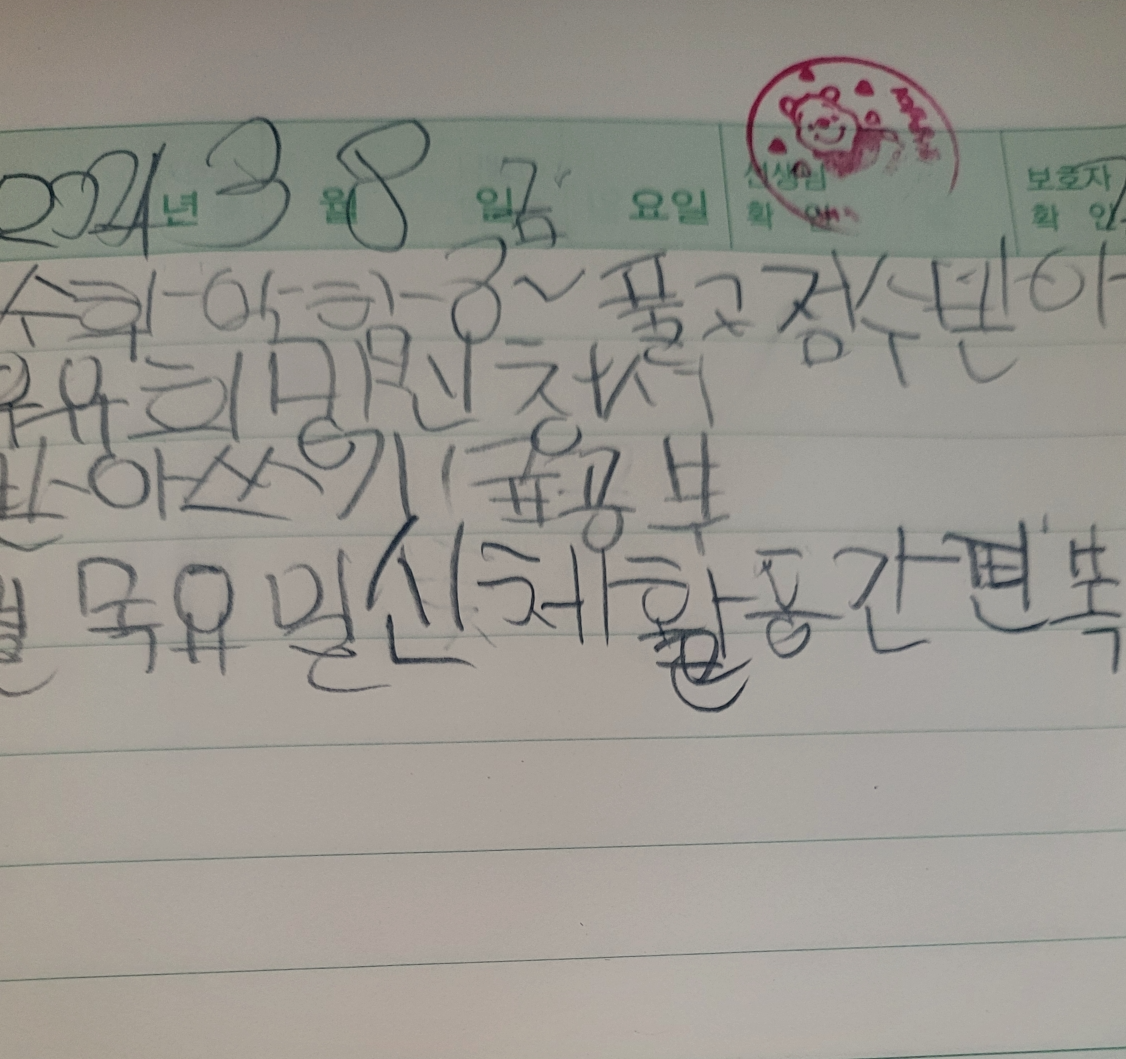 이제 칠판에 써놓은 알림장을 아이들이 스스로 써오고 선생님이 확인도장을 찍어주는 형태로 한다.