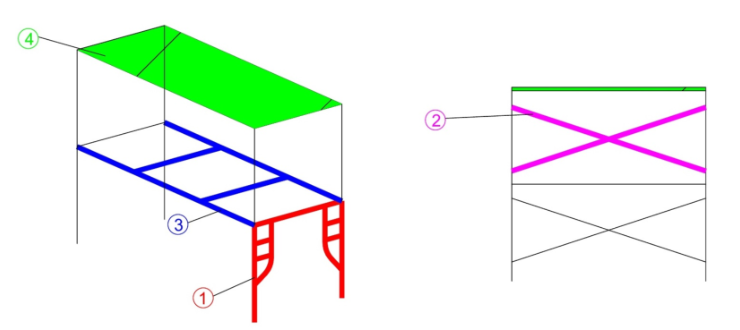 7.화면상의 강관틀 비계 구성요소 명칭을 쓰시오.(4점)