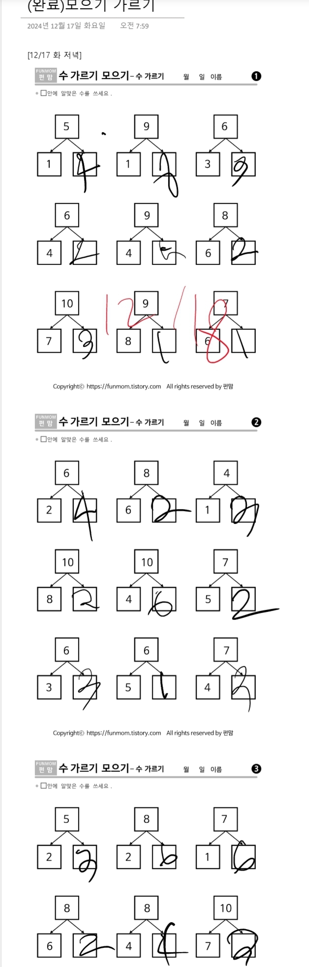 가르기 모으기 문제를 프린트 해서 다시 복습하도록 했다.