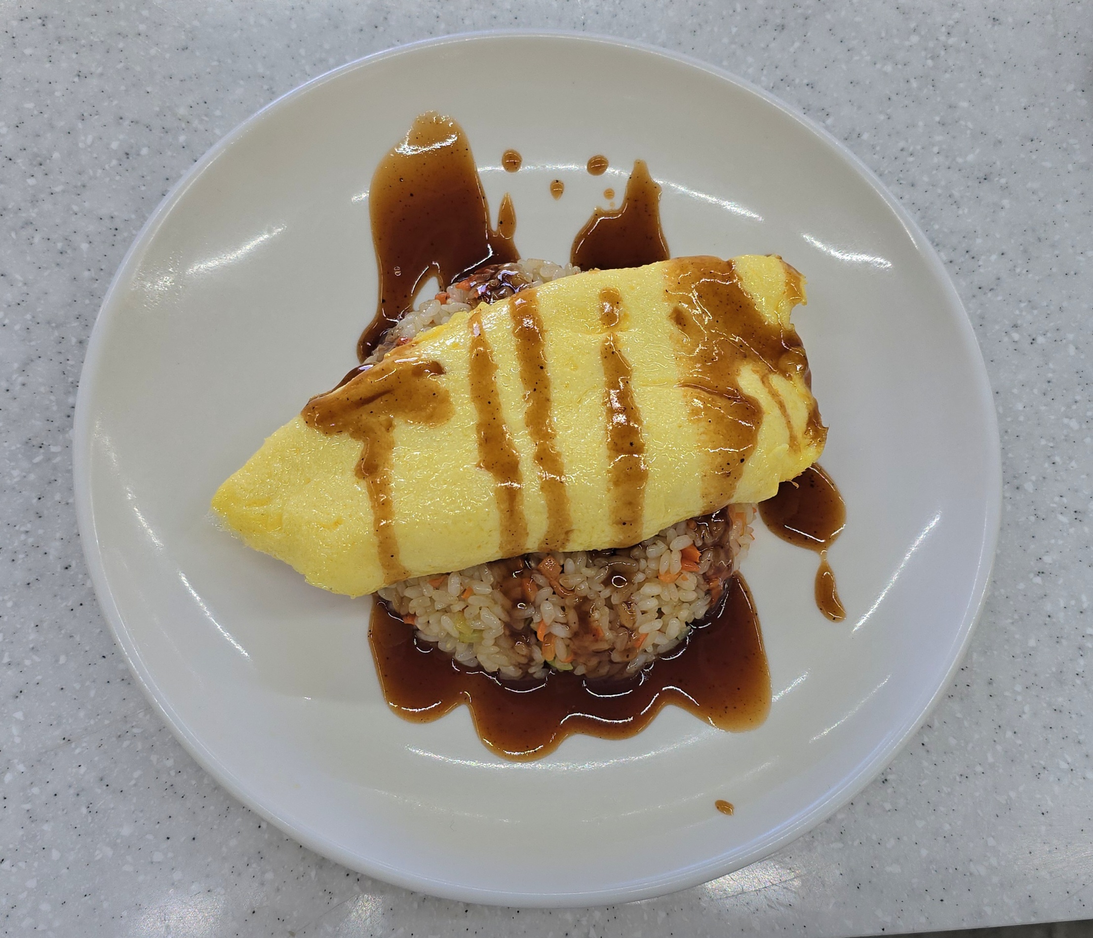 볶음밥을 공기 그릇에 넣고 모양을 만들어주고 만들어진 오믈렛을 위에 얹어주고 돈까스 소스 뿌려주기 ㅎ