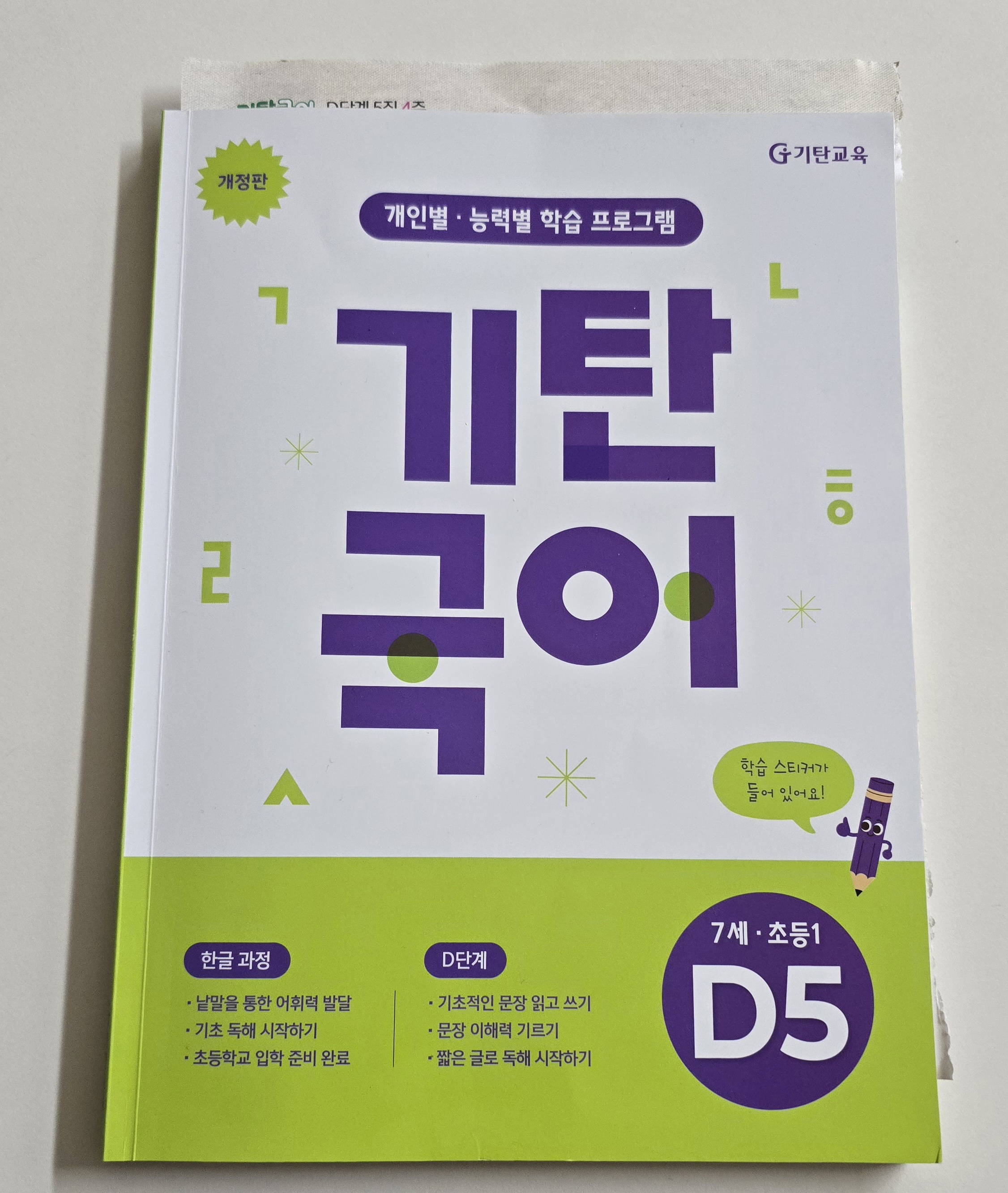완공한날 : 10월 15일 마지막으로 기탄국어 D5까지 완료했다. 확실히 D단계는 유치원생이 풀기 좋은것 같다. 조금 머리 큰 1학년한테는 쉽고.. 조금 느린 아이한테는 적절한 수준인 단계 문장을 써야하는 경우는 D단계에서는 "보기"가 다 제시되어있기때문에 골라서 쓸 수 있어서 쉽게 쓸 수 있는데 E단계로 넘어가면 자기가 생각해서 써야하고 추론문제도 수준이 높아져서 조금 어려워지는것 같다.그래도 자기가 생각해서 문장을 쓰는 단계까지 와서 기특하다. 예전같았으면은 거의 한글자도 쓰지도 못하고.. 나한테 물어봤었는데아직도 맞춤법은 산넘어산이네..😅글자 맞춤법은 계속 공부시켜야할것 같고.. 이야기를 이해하고 문제를 맞추는건 곧잘 하는것 같다.받침이 문제네.. ㅎㅎ 그래 .. 뭐 한번에 좋아지진 않으니까 꾸준..